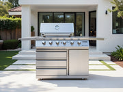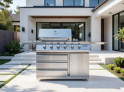 The Outback Signature II 4 Burner Hybrid gas barbecue comes fully assembled and is the ultimate luxury choice amongst all barbecues. An established favourite among discerning al fresco enthusiasts, it is integrated with the Multi-Cooking Surface system. The interchangeable circular grill can be switched to accommodate a pizza stone, griddle, wok, or any other Outback MCS surface to give versatility to your cooking experience. This hybrid model offers the option to cook with Outback Coconut Shell Briquettes to give the authentic charcoal flavour. A top seller in an exclusive stainless steel series, it offers auto electronic ignition, temperature gauge, extensive grill and roasting areas alongside ample cabinet and drawer storage space, rear and side brass burners, a ceramic infrared back burner and warming rack. An electric powered rotisserie and weather proof cover are optional extras. Signature 4 Burner is supplied with hose and propane regulator.
