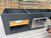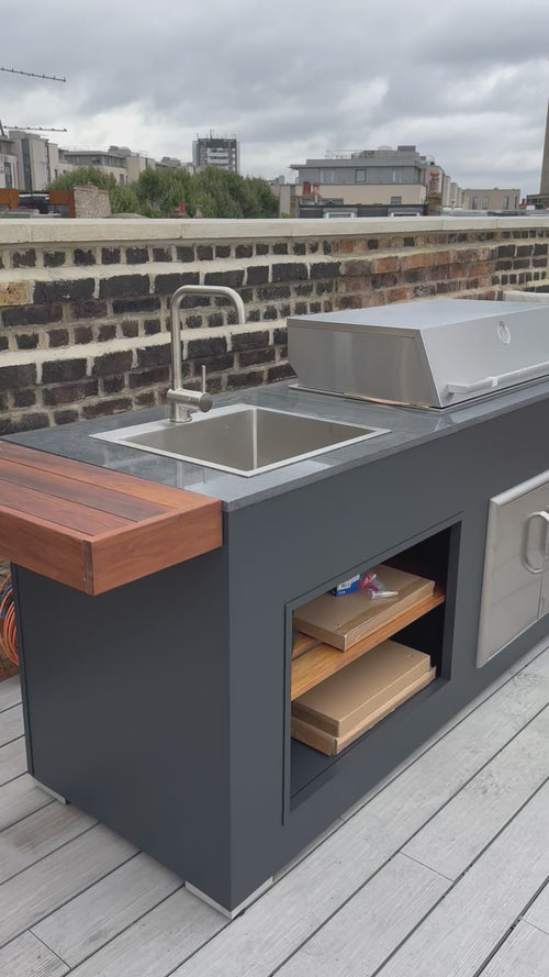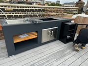 Extended "Medium Rare" Model Features: The "Medium Rare" is an expanded version of the "Rare" model, offering a professional-grade gas grill, built-in gas hob, a spacious work area, stainless steel sink, and a display drink cooler for a comprehensive outdoor cooking experience.