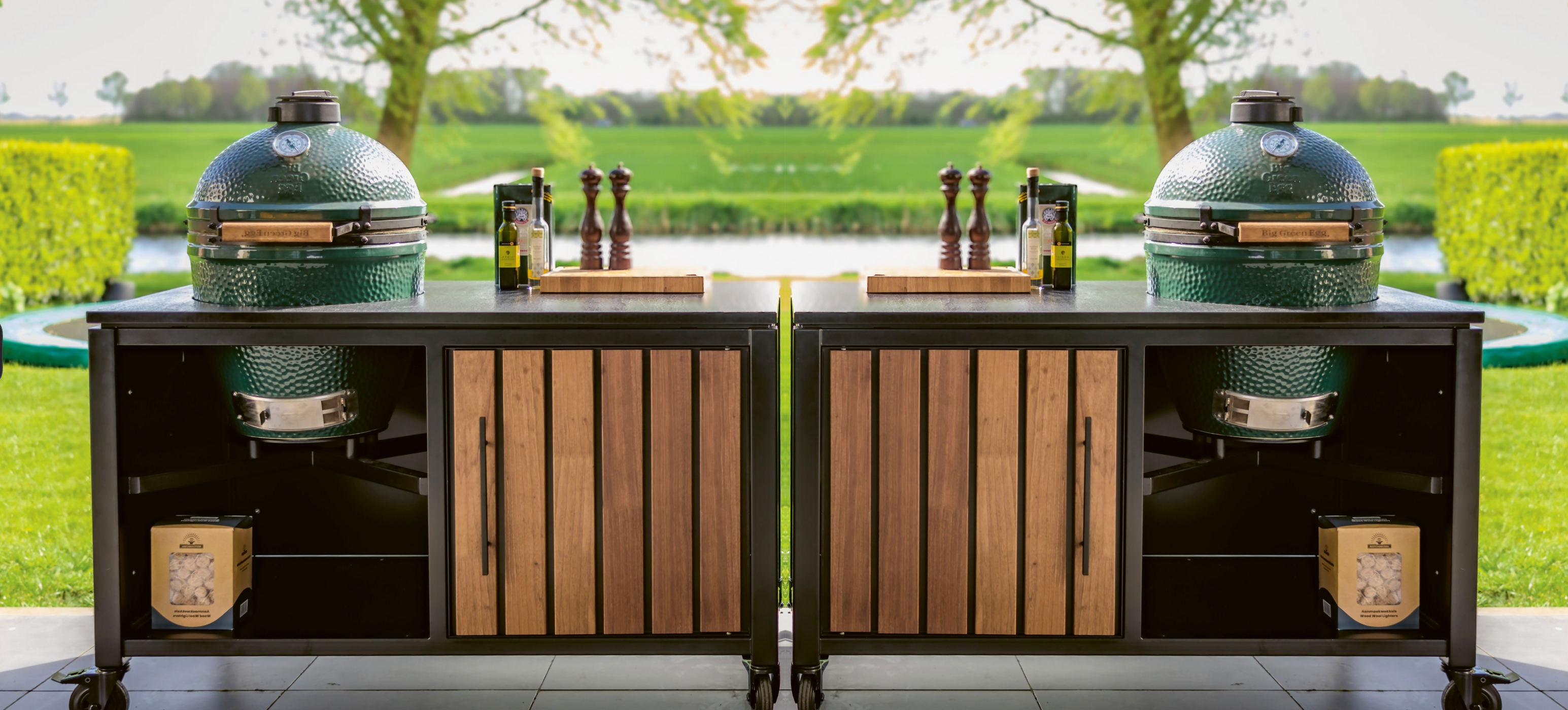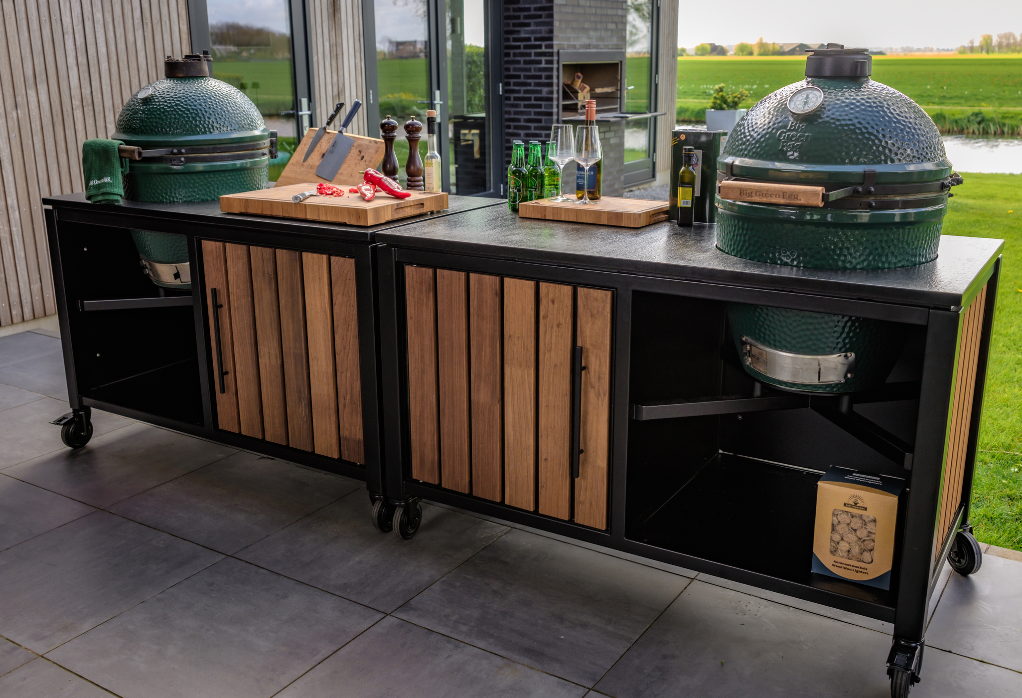 Luxurious Outdoor Kitchen Double Large Green Egg Kamado Grill and Cart