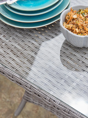 This dining set features a stunning double half-round weave in contemporary grey. It will add style and elegance to any space. The sturdy aluminum frame is built to last and will withstand outdoor use.