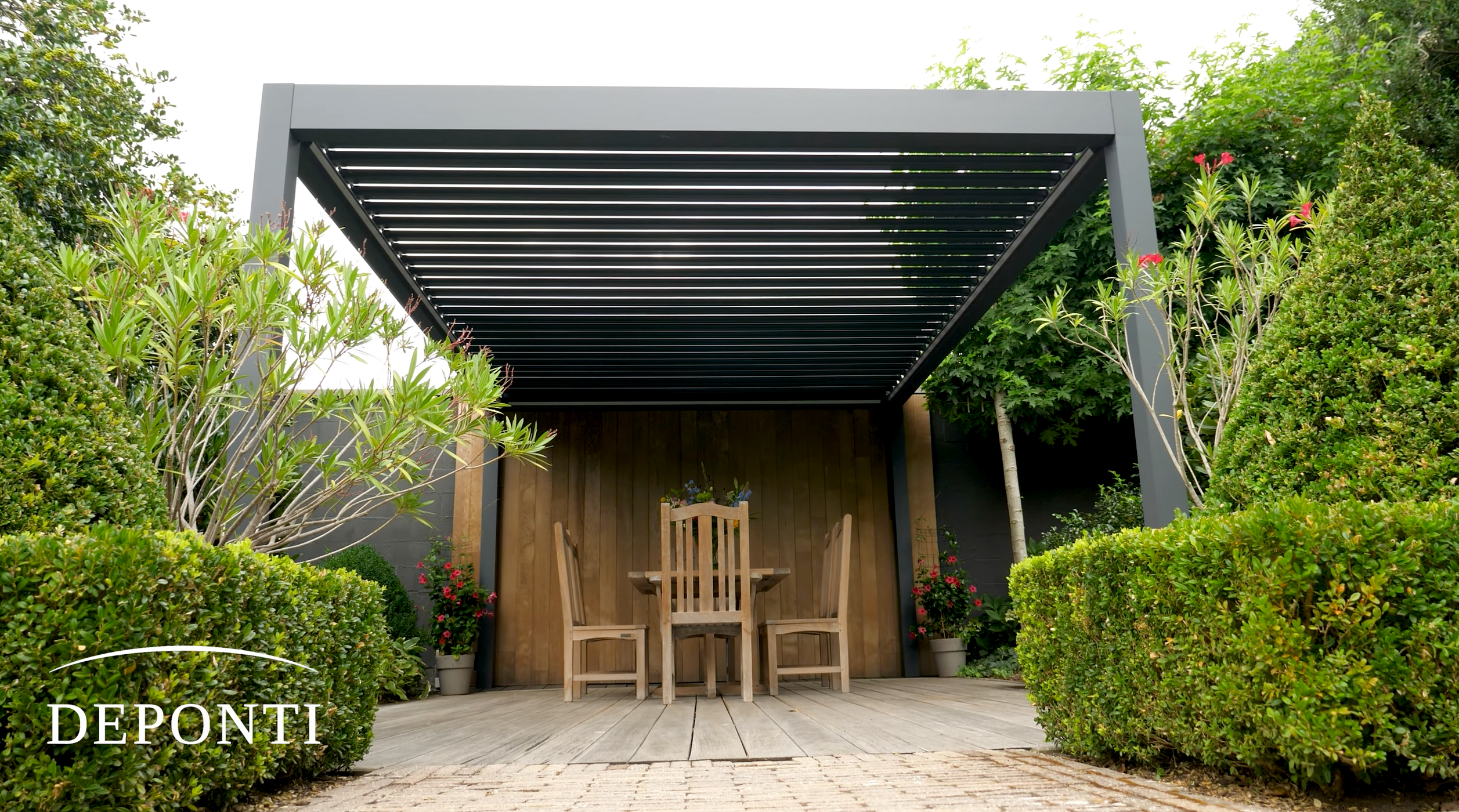 The panels of the Pinela roof can be tilted up to 120 degrees. The panels of the Pinela and the optional LED lighting can be controlled with the SOMFY remote control supplied. The Pinela can be free-standing or wall-mounted.