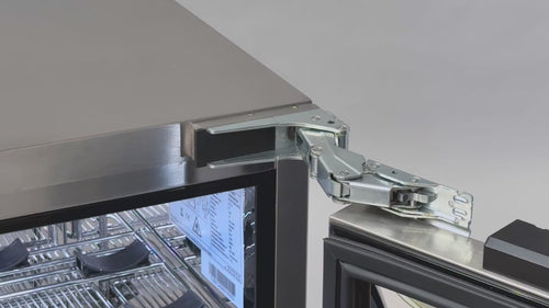 - Hinge limiter pin to restrict door opening from 115° to 90° if required.