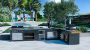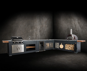 - Design: L-shaped model with a corner element that integrates a professional gas grill, built-in gas hob, and a wood-fired pizza oven for versatility.