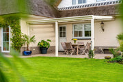 Deponti verandas can be supplied in infinite widths. This is done by coupling the patio covers widthwise. The gutter, wall and trim profiles are then supplied in multiple lengths of 4060mm, 5060mm, 6060mm or 7060mm. The centre-to-centre size of the beams, the number of sections and the needed glass width depend on the width of the Deponti veranda. The table below shows the dimensions.