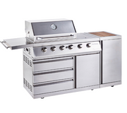 The Outback Signature II 4 Burner Hybrid gas barbecue comes fully assembled and is the ultimate luxury choice amongst all barbecues. An established favourite among discerning al fresco enthusiasts, it is integrated with the Multi-Cooking Surface system. The interchangeable circular grill can be switched to accommodate a pizza stone, griddle, wok, or any other Outback MCS surface to give versatility to your cooking experience. This hybrid model offers the option to cook with Outback Coconut Shell Briquettes to give the authentic charcoal flavour. A top seller in an exclusive stainless steel series, it offers auto electronic ignition, temperature gauge, extensive grill and roasting areas alongside ample cabinet and drawer storage space, rear and side brass burners, a ceramic infrared back burner and warming rack. An electric powered rotisserie and weather proof cover are optional extras. Signature 4 Burner is supplied with hose and propane regulator.