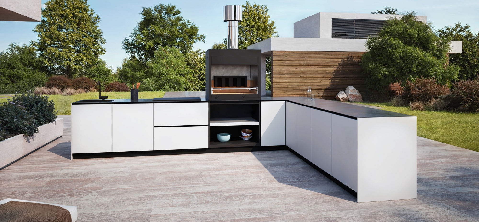 Complete with a built-in gas grill, kamado grill, gas hob, and a sleek bar area — it’s everything you need to entertain in style.