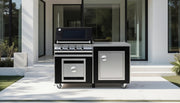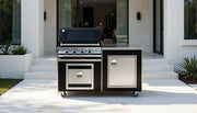 Featuring a deluxe 4 Burner gas BBQ and plain top serving area, below a single door display fridge, gas bottle storage cupboard. Front panels in stainless steel or can be coated to match the colour of the BBQ.