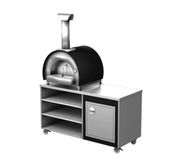 Featuring a Grande wood-fired oven and plain top serving area, below a single door general purpose cupboard and open shelving for storage. The front panel door comes in stainless steel or can be coated to match the oven.