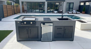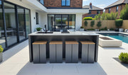 Grillandia Outdoor Kitchen Entertainment Bar and Stools - Brabura L-Class Original 20 Griddle, which in addition to the professional gas grill and the built-in gas hob, offers a much larger work surface, stainless steel sink and showcase drink cooler for a more complete outdoor kitchen experience.The product is based on a powder-coated 100% aluminum structure which can be easily assembled by the customer. It is equipped with high quality 304 stainless-steel doors and elements. Weather-proof thermo-wood shelves, legs and side wings ensure smooth and enjoyable grilling in all conditions. And the UV, frost and stain resistant polished granite countertop adds stability and elegance to this beautiful model.