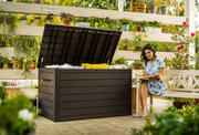 The Keter XXL Deck Box in Brown from Norfolk Leisure made with resin material is an outdoor storage unit perfect for storing your garden furniture cushions when not in use. This XXL Deck Box can also be utilised as seating. The addition of pistons allows for an ease of access when opening/closing the storage unit.