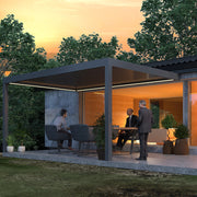 The Pinela Deluxe allows you to create an open space above your terrace in no time. It is possible to slide the panels to one side. The panels of the Pinela Deluxe and the optional LED lighting can be operated by means of the SOMFY remote control. The Pinela Deluxe can be free-standing or wall-mounted.