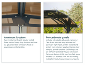 - Resilient bronze-tinted 6 mm twin-wall polycarbonate glazing; does not fracture, becomes brittle, or turns yellow over time.