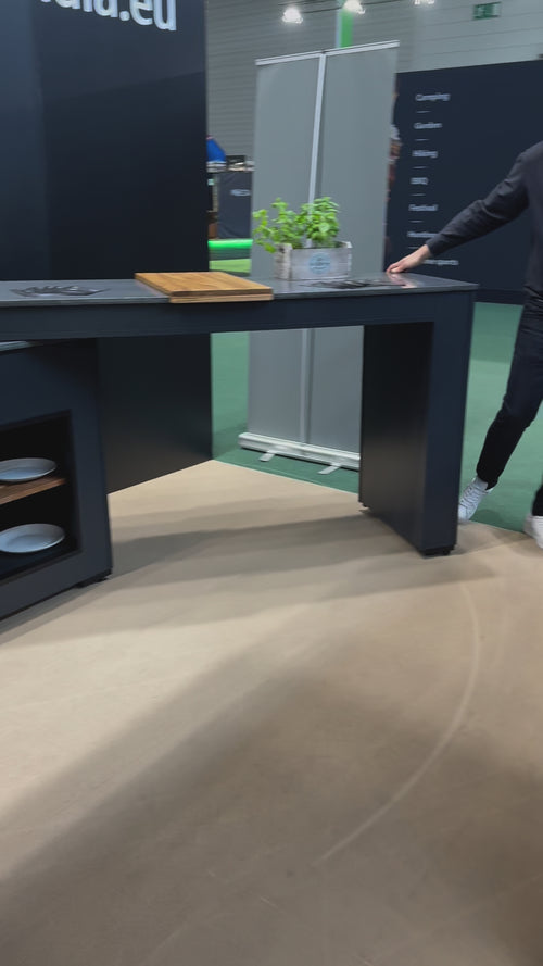 • Patented swiveling mobile bar counter that functions as a prep space, dining area, and can be adjusted as needed.