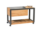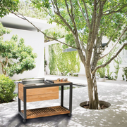 The frame combines matte black powder-coated aluminum with premium teak wood, while the cooking surface is made from 316-grade stainless steel, perfect for coastal environments.