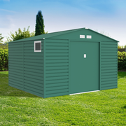 The Hypnos Apex Metal Shed by Lotus 11x10.5 has the strength and security for all your storage needs. Made from Hot-Dipped galvanized steel with a zinc steel frame, the Hypnos Apex Metal Shed is weatherproof and provides easy access with the sliding double doors and a small ramp to help guide heavier objects with wheels into the storage space.