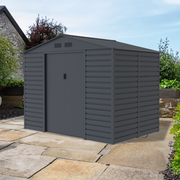 The Hypnos Apex Metal Shed by Lotus 9x6 has the strength and security for all your storage needs. Made from Hot-Dipped galvanized steel with a zinc steel frame, the Hypnos Apex Metal Shed is weatherproof and provides easy access with the sliding double doors and a small ramp to help guide heavier objects with wheels into the storage space.