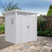 The Titan Pent Metal Shed by Lotus is a modern and stylish metal shed, the Titan gives you a functional storage in a secure and attractive unit. Equipped with a flat roof and skylights which floods with space with natural light, included with a window on the side which opens.