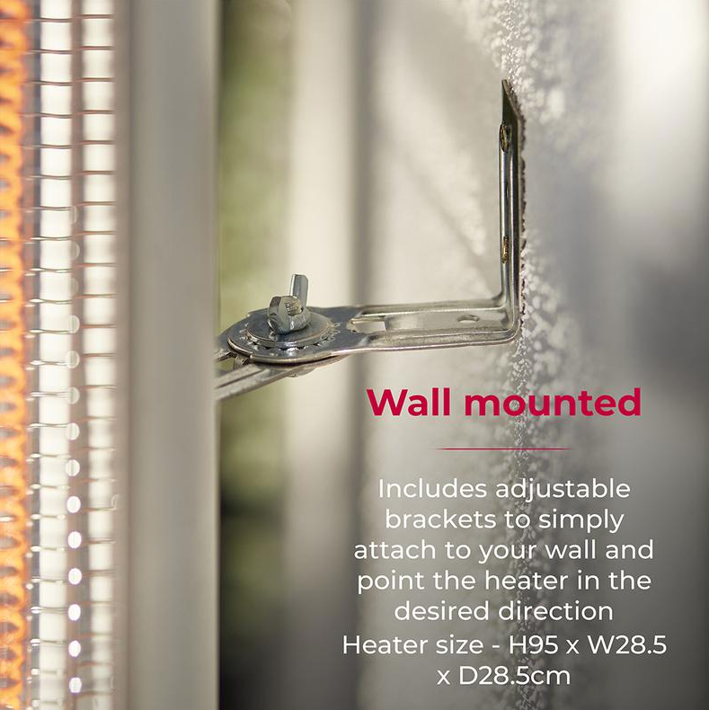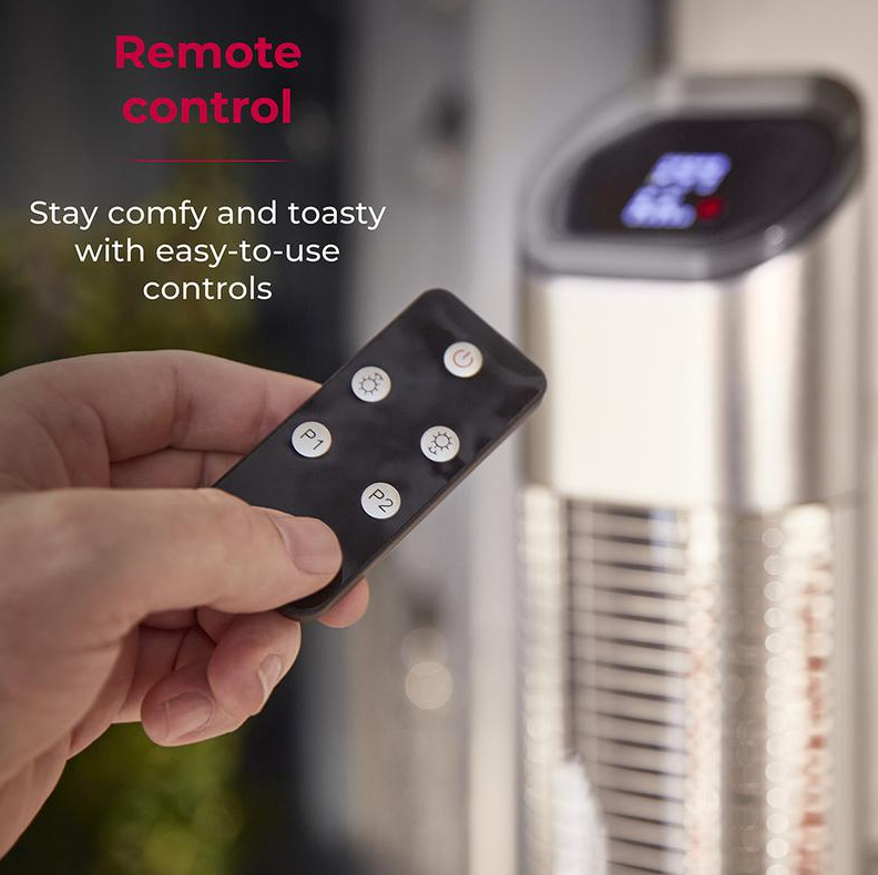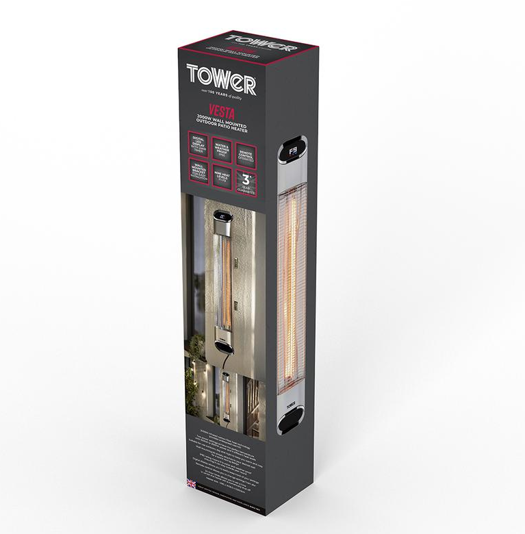 Heat up your space for less with the Tower Wall Mounted Patio Heater. Using smart infrared technology, the heat directly targets you and your guests instead of circulating around the patio, whilst the carbon fiber tube provides a more cost effective way of keeping warm outdoors. Choose between 1000W and 2000W with an additional 9 heating levels to achieve the perfect temperature. Come rain or shine your wall mounted heater will be protected and safe to use, with the highest waterproof rating on the market of IP65. Simply choose your desired spot on the patio wall and attach this heater using the included wall bracket. With powerful heating technology and space saving design, this heater is perfect for a home patio, bars, restaurants and more. And, you can effortlessly operate your heater in comfort using the remote control. Switch it on/off and adjust the heat settings at the touch of a button.