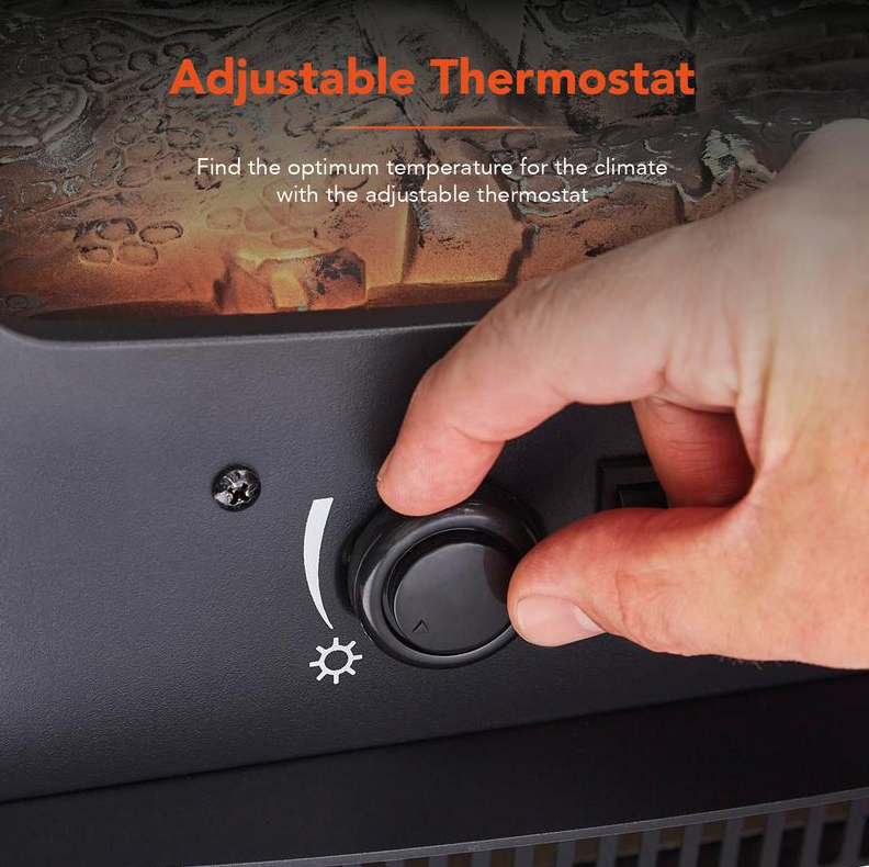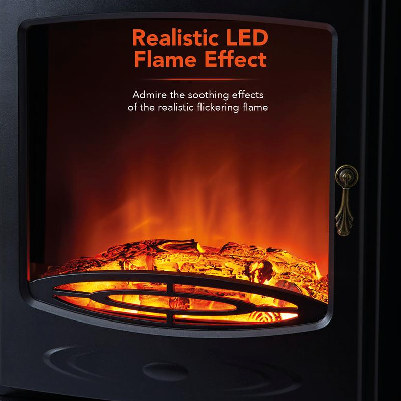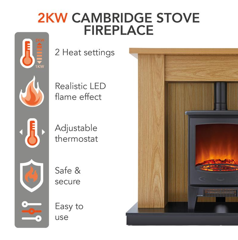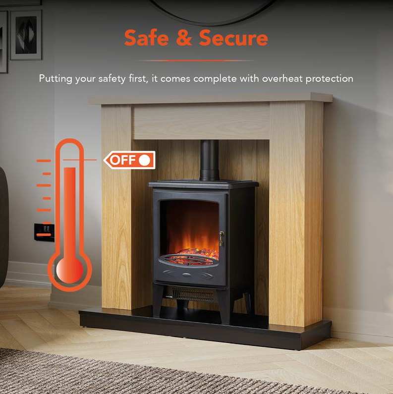 Create a focal display to set off your living space with the traditional design features of this stove fireplace suite. The 2 heat settings can be set to a 950W or a 1850W temperature setting to create a warming heat around the immediate area. The black cast stove fire creates a realistic LED flame effect to give the look and feel of a real fire, with an adjustable flame brightness to help set your preferred ambience. The black stripe surround and traditional oak mantelpiece creates a focal feature in your living area, with no assembly required so you can begin operation at your earliest convenience. The safety cut out feature ensures safe operation during use.