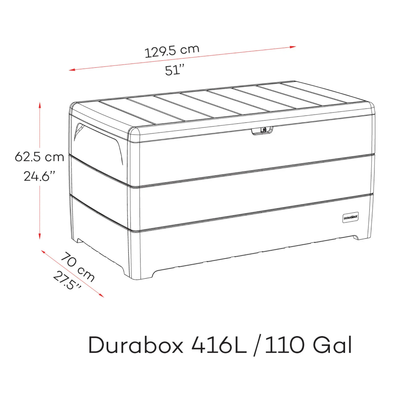 Keep your garden or outdoor space neat and tidy thanks to the gratuitous storage provided by the Durabox Storage box. Providing 416 litres of internal storage with a maximum internal load of 50 kilograms, the Durabox is capable of storing heavy tools, all kinds of toys, cushions, folding chairs and more.