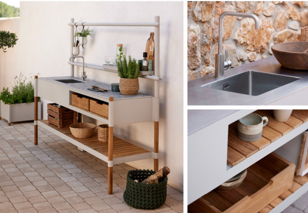 Elevate your outdoor culinary space with the Sticks Kitchen—a perfect blend of natural elegance and practical design. Inspired by the organic beauty of sticks, this outdoor kitchen combines warm teak shelving with modern functionality to create a stunning, organized cooking area.