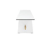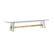The lead time for this product is approximately 6–8 weeks. The design centers on stabilizing and connecting the slightly outward-angled cheeks of this large-format table and bench using a solid teak board. A handcrafted wedge construction firmly anchors the bridge and cheeks, resulting in a distinctive and dynamic shape. The combination of flat HPL material and robust teak wood creates a striking material contrast that is both aesthetically pleasing and structurally sound.