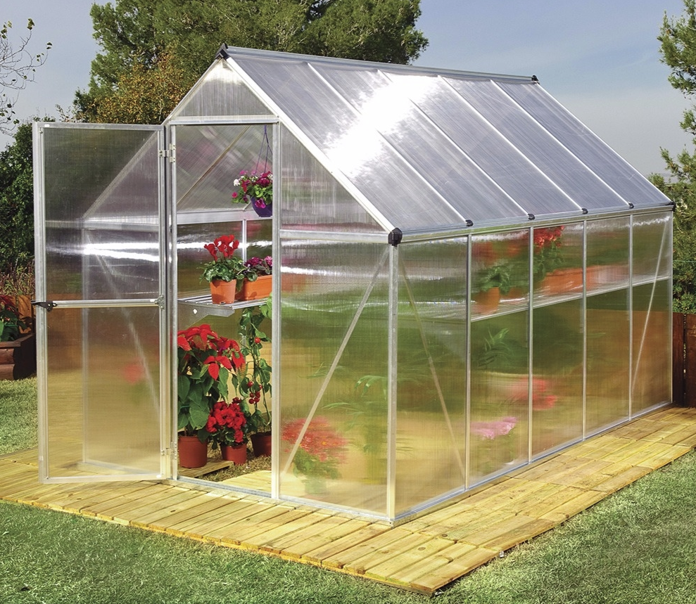 Palram Canopia's Mythos 6 feet (wide) by 10 feet (deep) greenhouse boasts an attractive, sleek silver frame with twin-walled glazing panels and plenty of additional features that will complete a thriving environment.