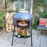 Our wood-fired Dome Oven is made from high quality, robust British steel, built to withstand the elements. The domed steel roof reflects the heat for higher cooking temperatures, and the rotating cooking platform cooks your food more evenly without losing heat from opening the oven door.