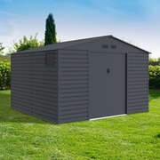 The Hypnos Apex Metal Shed by Lotus 11x10.5 has the strength and security for all your storage needs. Made from Hot-Dipped galvanized steel with a zinc steel frame, the Hypnos Apex Metal Shed is weatherproof and provides easy access with the sliding double doors and a small ramp to help guide heavier objects with wheels into the storage space.