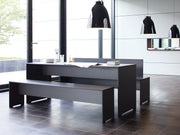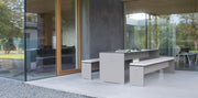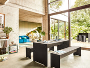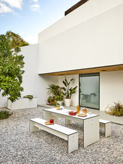 The table’s straight, clean lines and weather-resistant build make it a standout piece for interiors, terraces, and outdoor settings. Its central support beam ensures stability, while its outer edges align seamlessly with the tabletop.