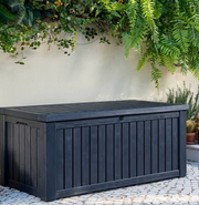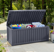 Get the sleek look of wood panels without any maintenance, thanks to the durable resin construction of the Rockwood series. Providing stylish and fully weather-resistant durability, this extra-large storage box sets 2 adults comfortably. It comes with an automatic opening mechanism and is suitable for storing even your largest items.
