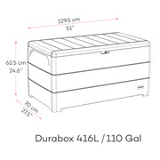 Keep your garden or outdoor space neat and tidy thanks to the gratuitous storage provided by the Durabox Storage box. Providing 416 litres of internal storage with a maximum internal load of 50 kilograms, the Durabox is capable of storing heavy tools, all kinds of toys, cushions, folding chairs and more.