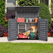 Using this storage box is simple with its two different door entries: the piston-operated arc lid which gives you vertical access to the interior and the wide-opening double doors which provide horizontal access to the unit. The lower double doors make it easy to store large items such as furniture, barbecues and bins, while the top door gives quick, easy accessibility to the unit as a whole.