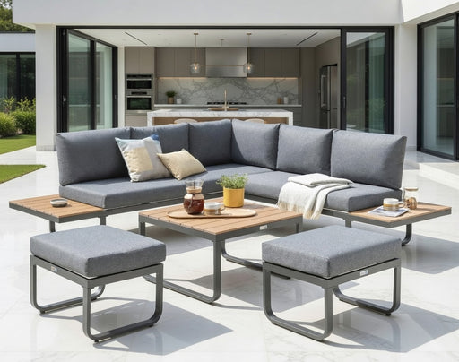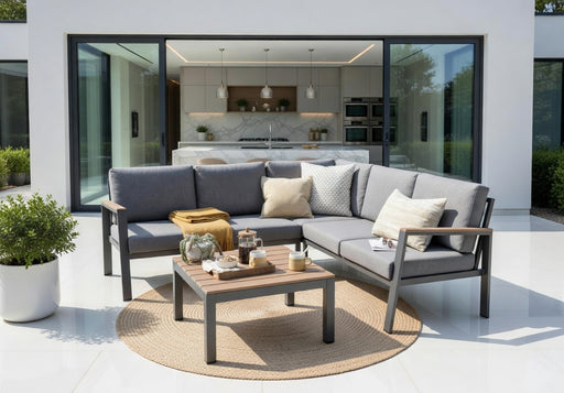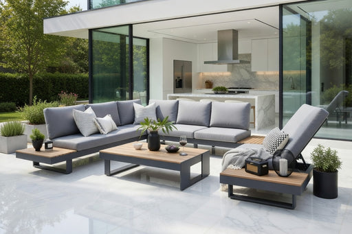 View full detailsEaston Large Corner Set With Sun Recliner -Anthracite Aluminium Frame with Poly Wood Table Top and Sides – Grey Cushions