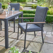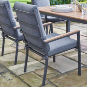 - Introducing the Easton 6 Seater Dining Set – a sleek and durable outdoor ensemble designed for your dining and relaxation needs. The 160x100cm table with a Teak Look Poly Wood top and sides provides an attractive and robust surface for your outdoor dining and entertaining. The set includes Dark Stone Grey seat and back cushions adding comfort and style to your outdoor dining and relaxation experience