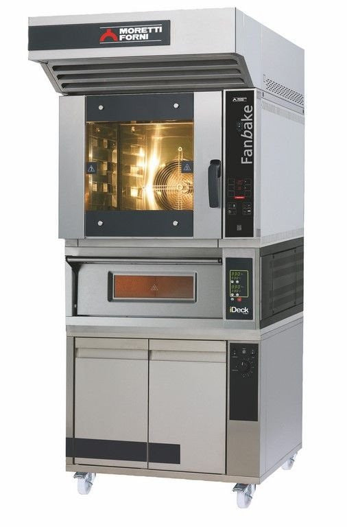 These Stylish Moretti Forni Stacked ovens are designed for Operators wanting the flexibilty of convection oven cooking and traditional deck oven cooking. These ovens can be designed to your own requirements - two deck ovens siting under a 5 rack convection oven, open stand, prover stand or prover base with humidity control.